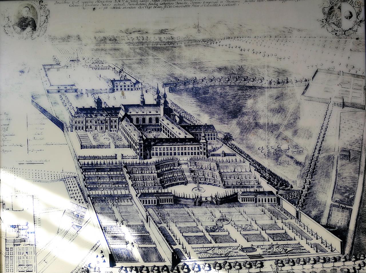 Historischer Stich des Klosters und seiner Gartenanlagen