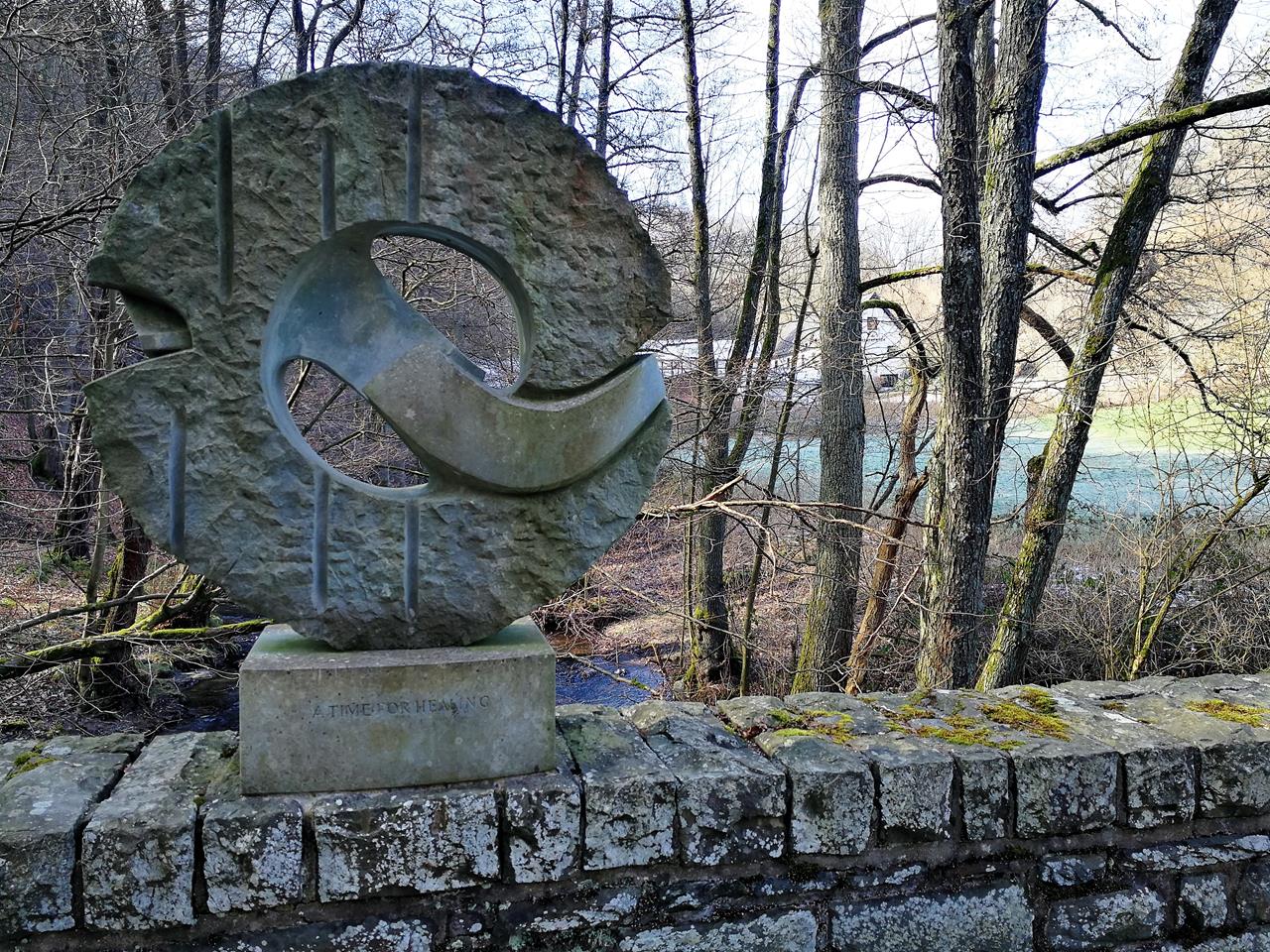 Gedenkstein auf der Kallbrücke an der Mestrenger Mühle für einen deutschen Sanitätsoffizier, der verrwundeten amerikanischen Soldaten bei der Schlacht im Hürtgenwald half