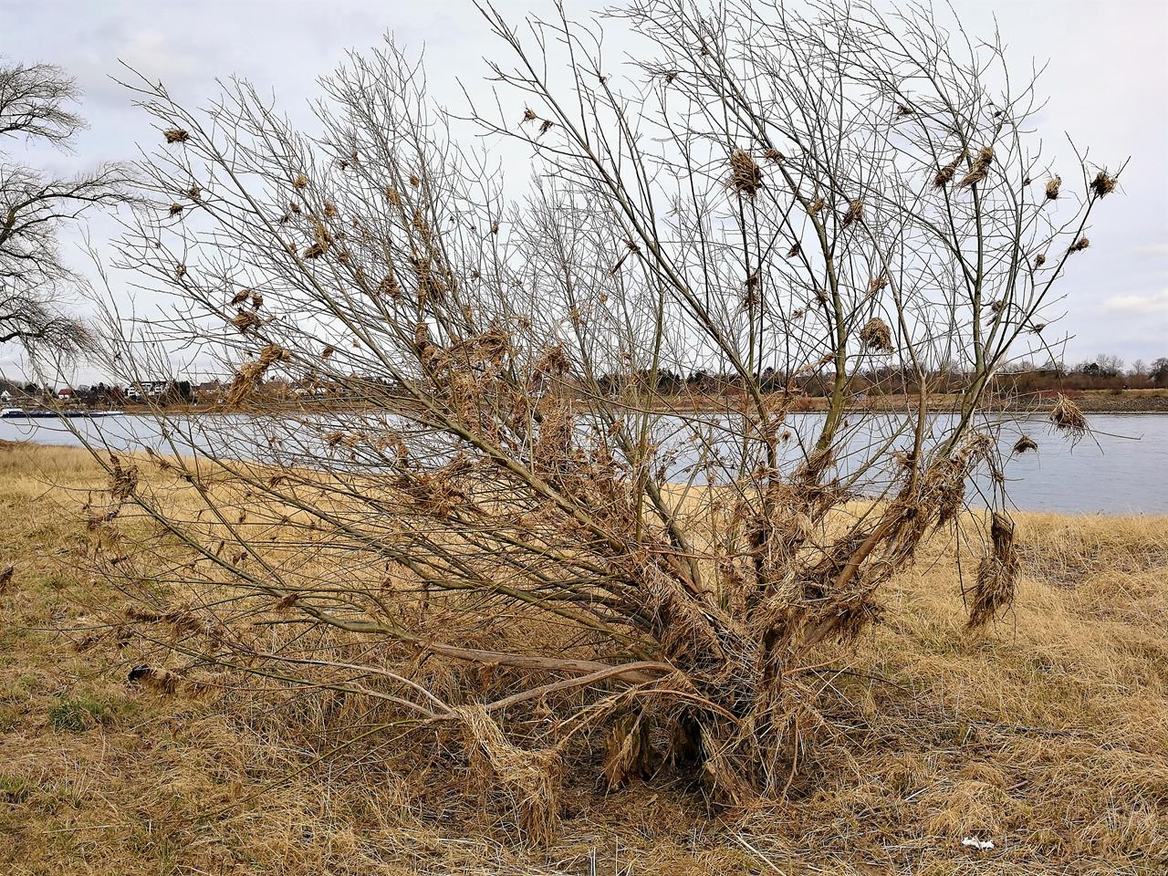 Hinterlassenschaften des letzten Rheinhochwassers in einem Baum am Ufer