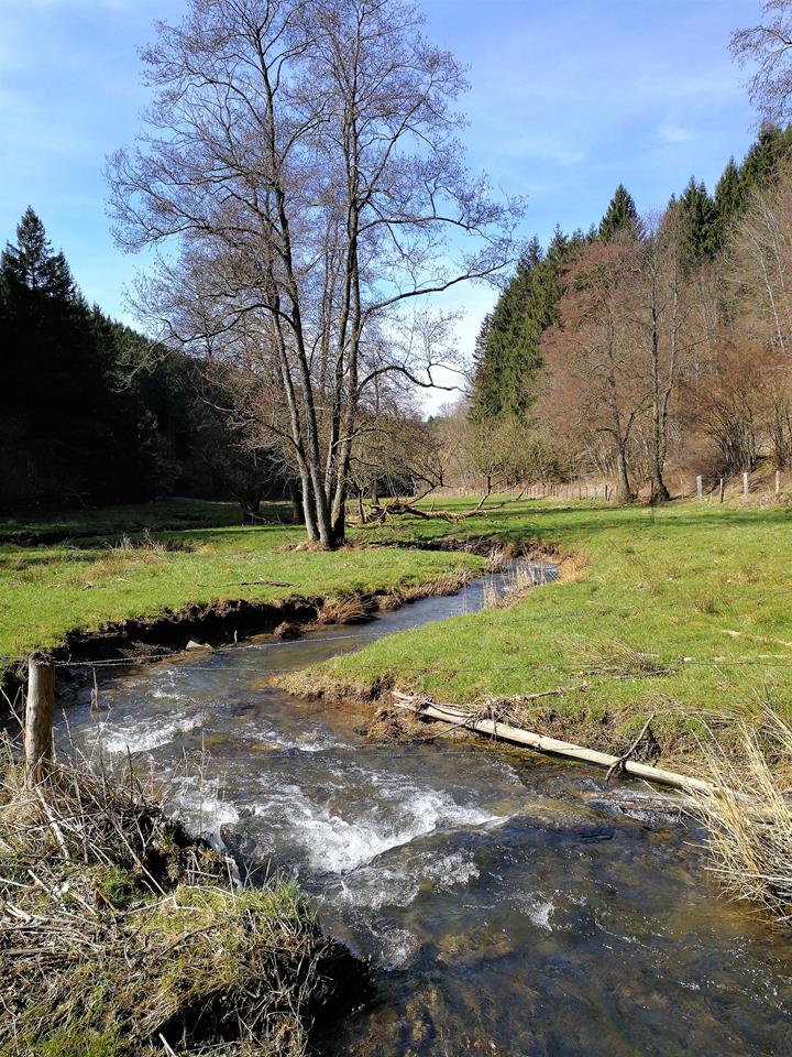 ← Zurück Weiter → Die mäandernde Irmsch im Talgrund hinter Auel. Der Bach bildet hier die Grenze zwischen Belgien und Deutschland.