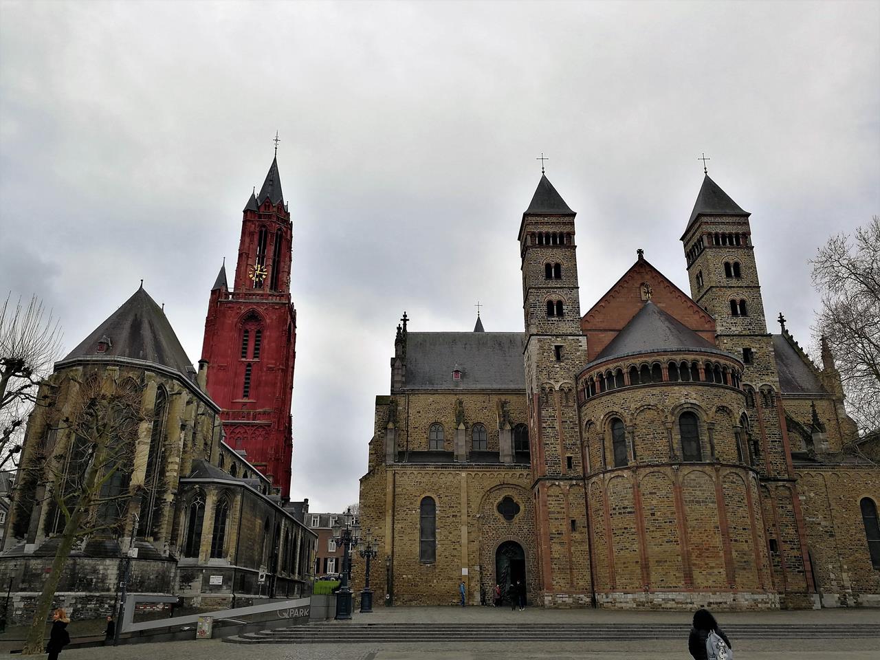 ← Zurück Weiter → Am Vrijthof: Links die Sankt-Johannis-Kirche (Sint-Janskerk), rechts die Sankt-Servatius-Basilika (Sint Servaasbasiliek)