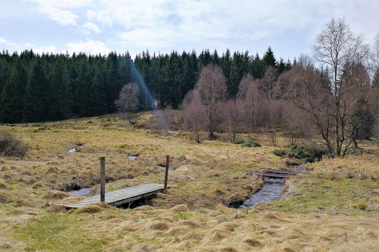 Links queren Fußgänger den Perlenbach, rechts Armeefahrzeuge