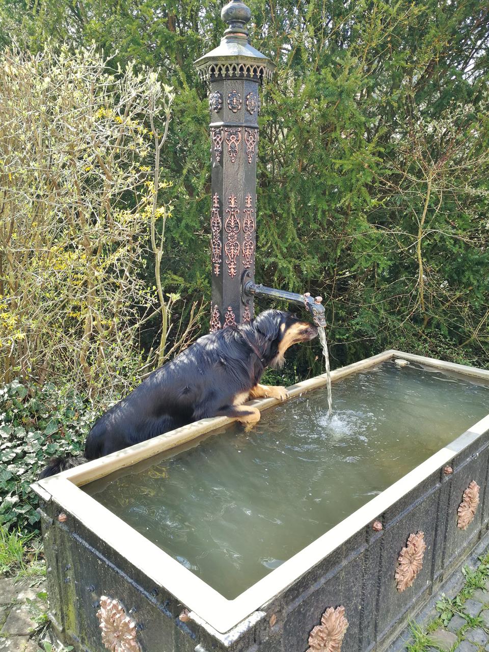 In Niederauroff: Doxi stärkt sich am gusseisernen Brunnen in der Brunnenstraße
