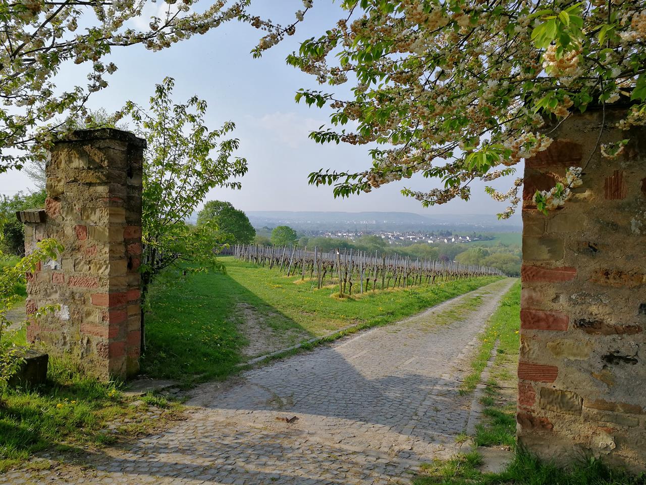 Blick durch den Weinberg hinunter nach Hallgarten