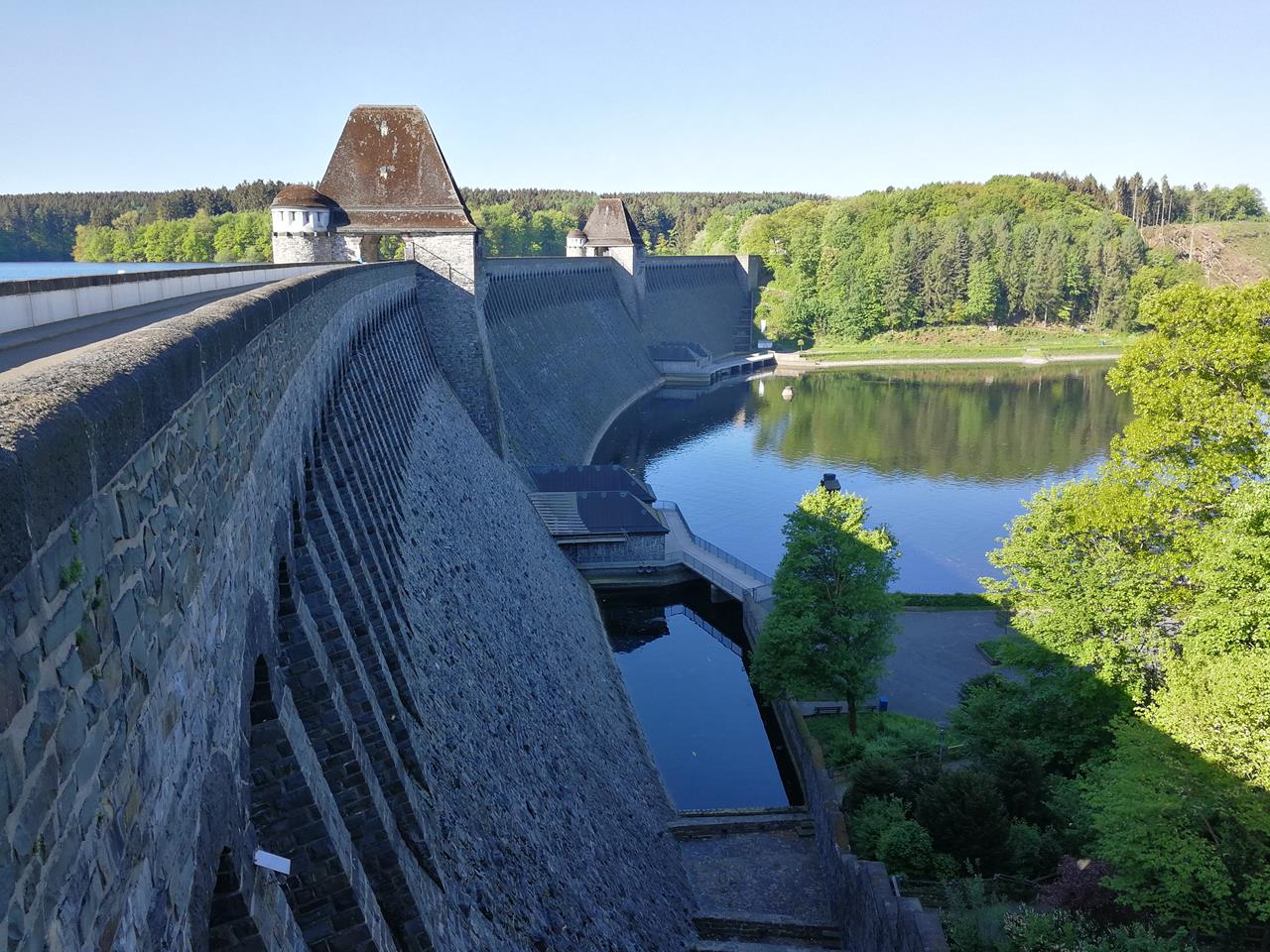 Blick von der Staumauer hinunter ins Auslaufbecken