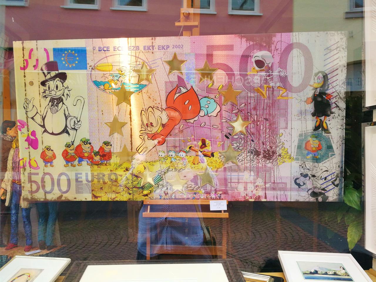 ← Zurück Weiter → Gemälde im Schaufenster einer Galerie. Ein 500 Euro-Schein zum Preis von 3.400 Euro. Ob das ein gutes Geschäft ist?