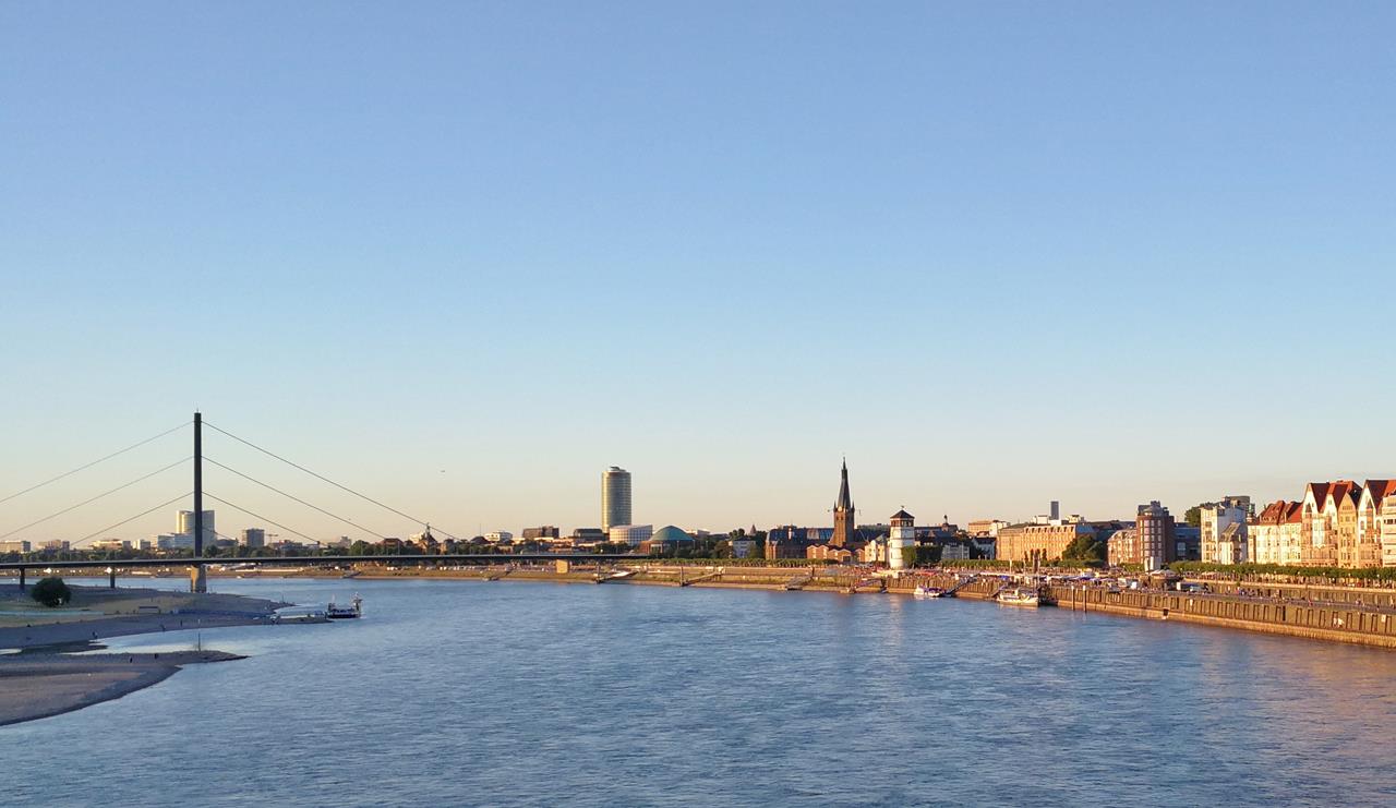 Blick von der Rheinkniebrücke auf die Altstadt am Rheinufer