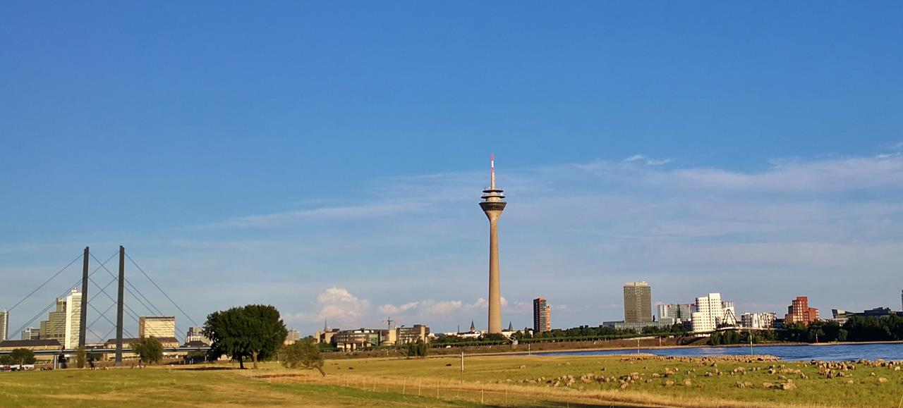 ← Zurück Weiter → Wahrzeichen von Düsseldorf: Der Funkturm, der Landtag und die Gehry-Bauten am Hafen