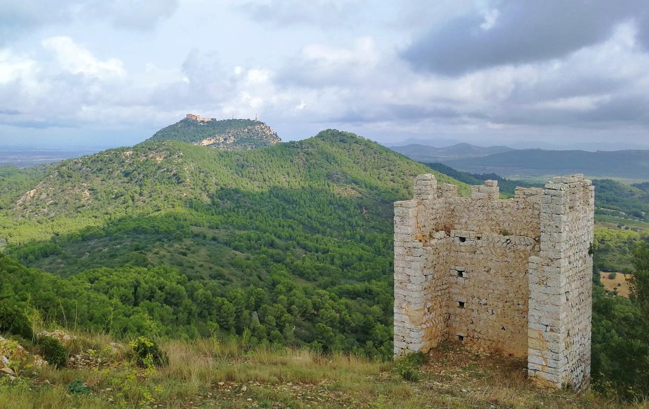 Reste eines alten Festungsturms mit dem Kloster Sant Salvador im Hintergrund
