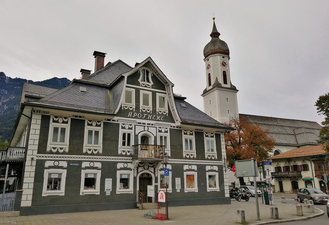 Alte Apotheke und Kirche in Garmisch