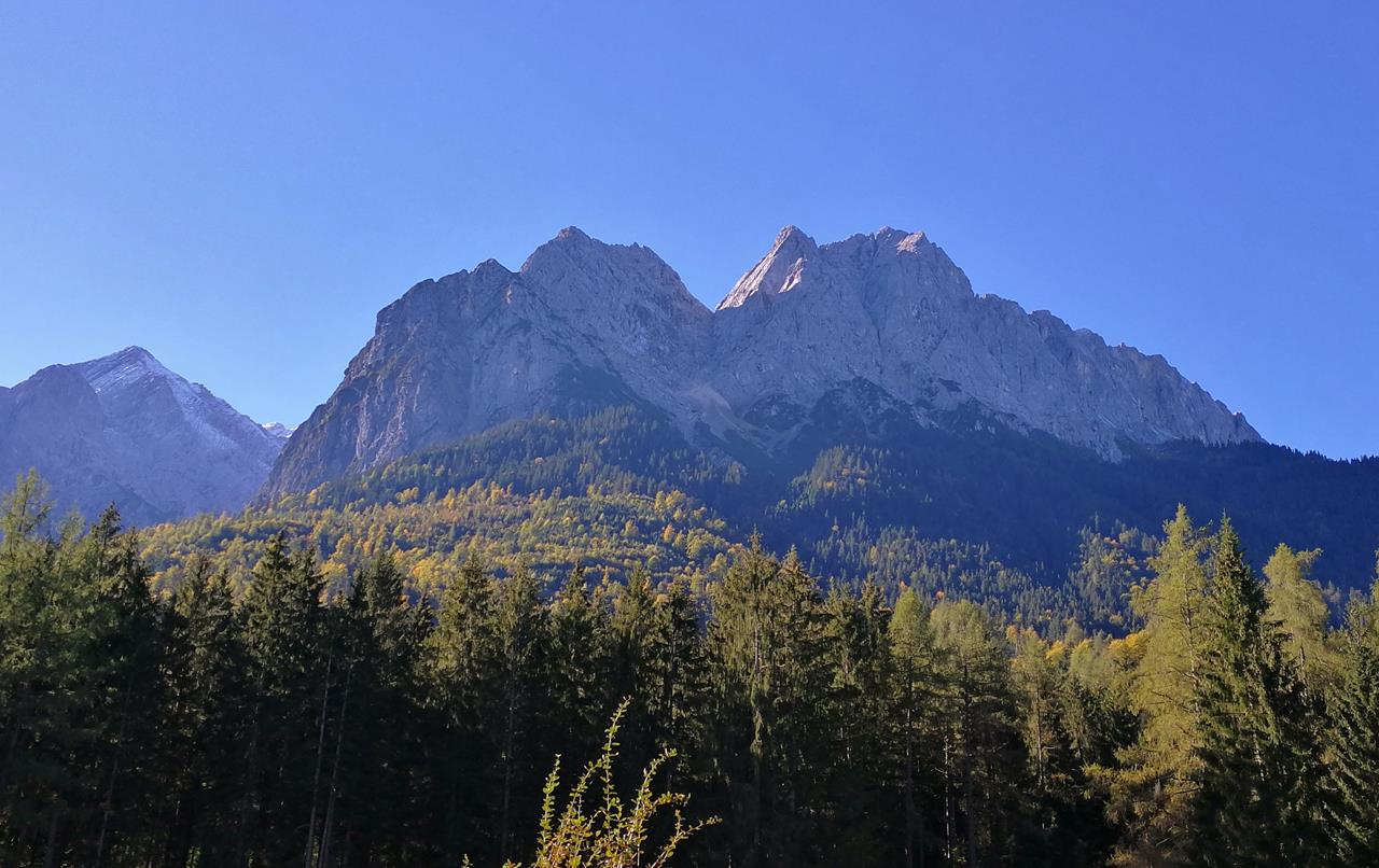 ← Zurück Weiter → Das Bergmassiv nordöstlich der Zugspitze: Großer Waxenstein und Südliche Riffelspitze
