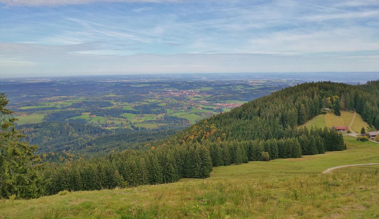 ← Zurück Weiter → Blick vom Gindelalmschneid in die Ebene vor dem Hochland. Am Horizont ist der Großraum München zu erkennen.