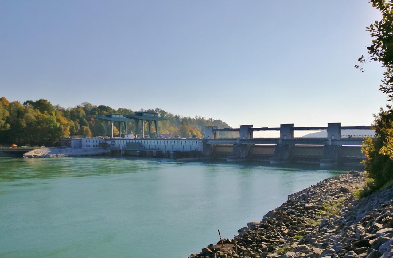 Hinter der großen Staustufe am Wasserkraftwerk wirkt der Inn schmal und seicht