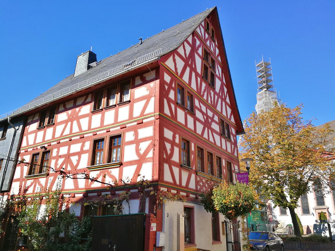 Fachwerkhaus vor der gerade eingerüsteten Pfarrkirche St. Peter und Paul