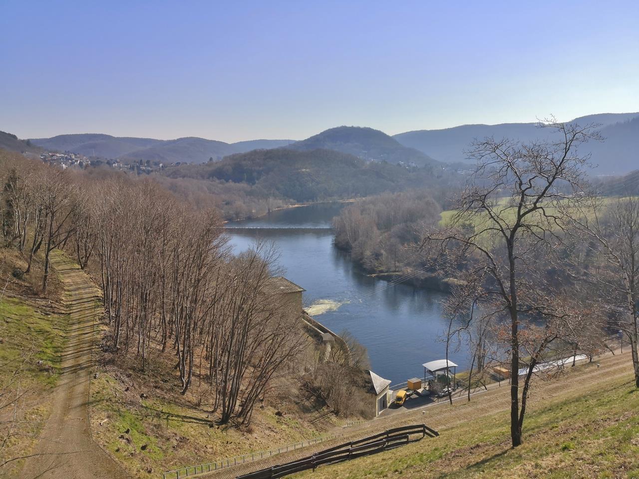 Ablauf der Rurtalsperre, im Hintergrund Heimbach