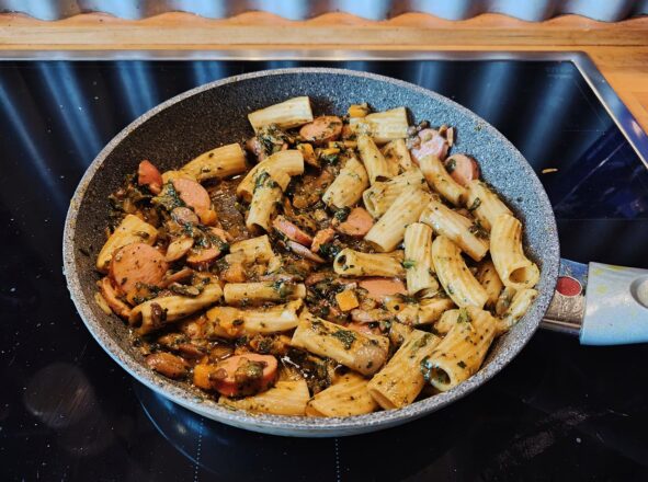 Wie praktisch, wenn man im Herbst schon für den Winter vorgekocht hat. Als im Oktober Kürbis-Zeit war, habe ich ein interessantes Nudel-Rezept entdeckt und nachgekocht: Tortiglioni-Nudeln mit kleingeschnittenen Stücken vom Hokkaido-Kürbis, dazu Champignons und Hartkäse-Würfel, sowie Ruccola.