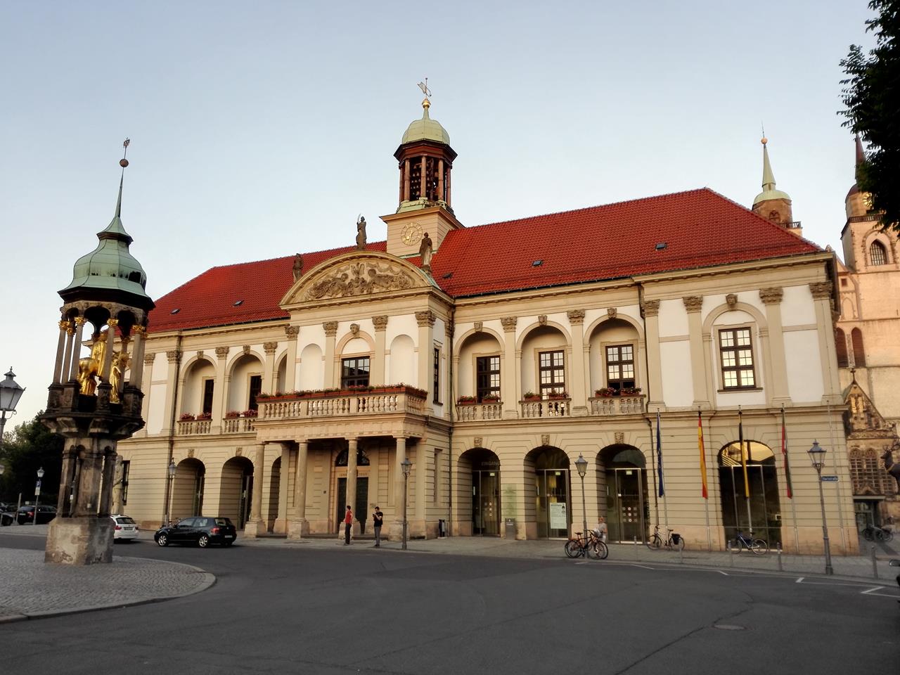 Das Alte Rathaus am Marktplatz, davor der „Goldene Reiter“