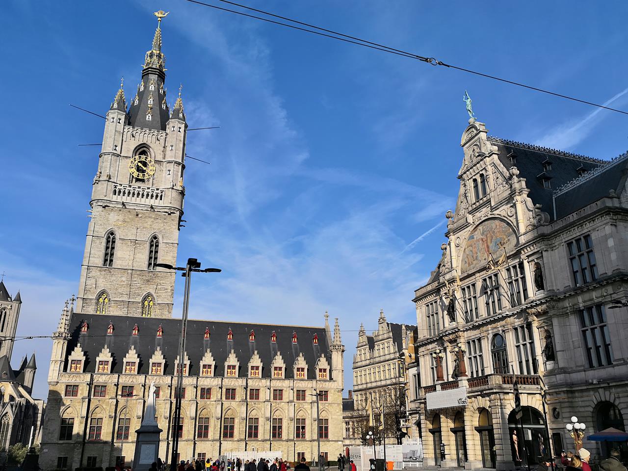 ← Zurück Weiter → Blick vom Sint Baafsplein vor der Kathedrale zum Belffried und der Tuchhalle. Rechts das Nationaltheater Gent.
