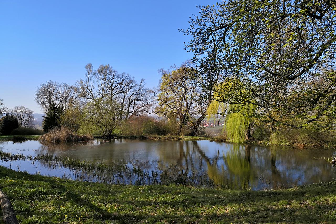 Teich neben dem Schloss mit Blick zwischen den Bäumen hinunter nach Weimar