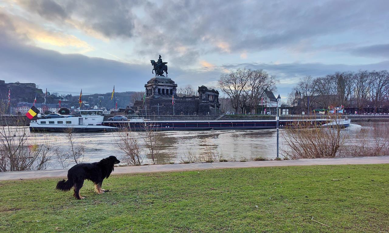 Ein Frachtschiff biegt vom Rhein in die Mosel ein