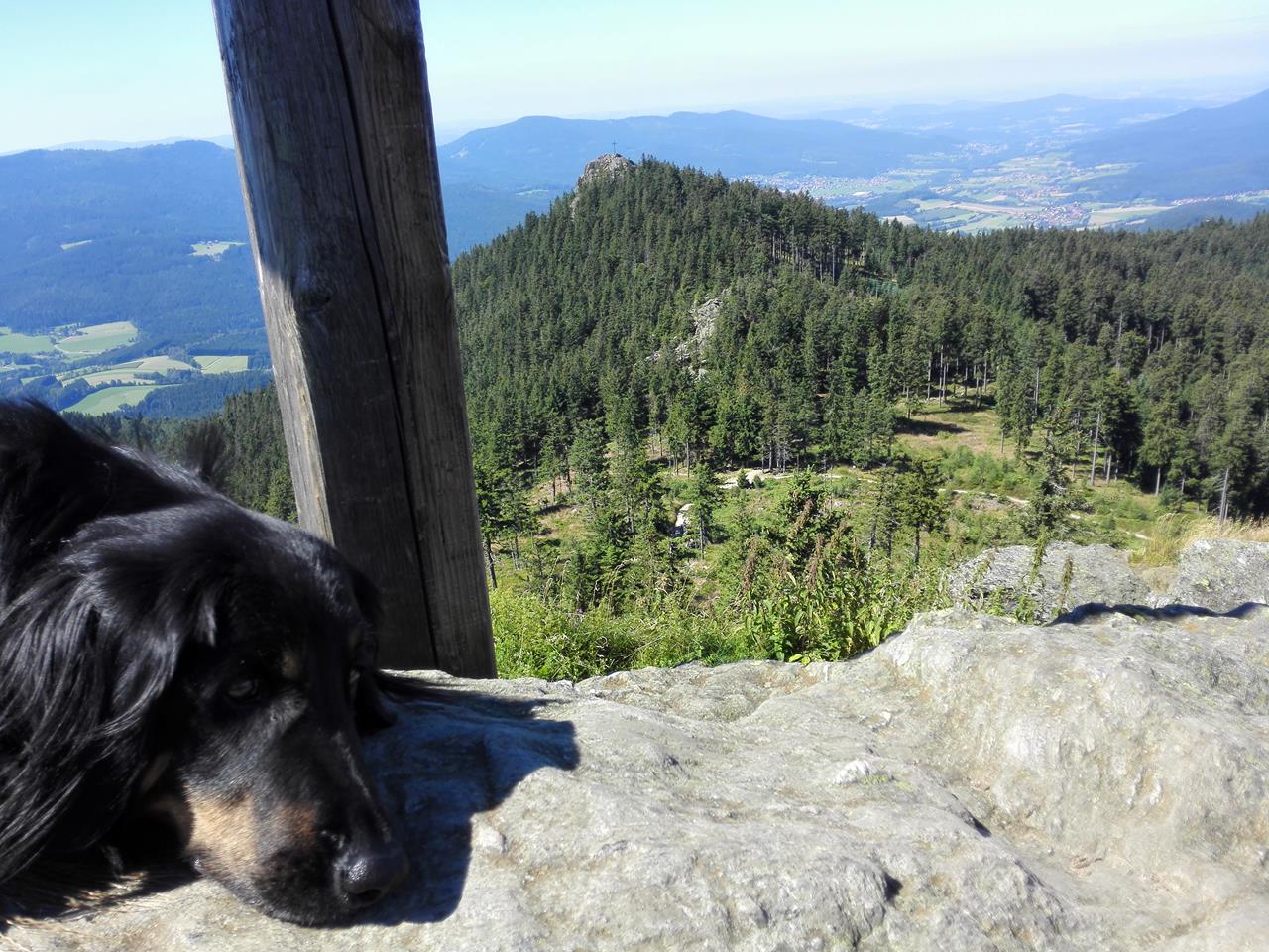 lam_aug_2016_038_1280x960 ← Zurück Weiter → Doxi am Gipfelkreuz des Großen Osser, im Hintergrund der Kleine Osser