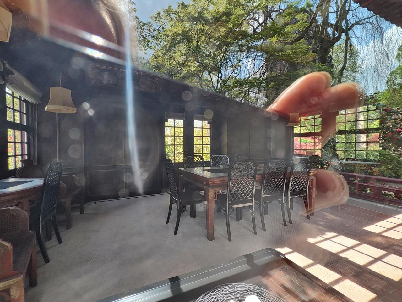 Verspiegelter Blick in Innere des Teehauses