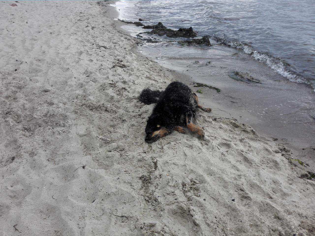 Erst mal das nasse Fell im Sand abschuggeln