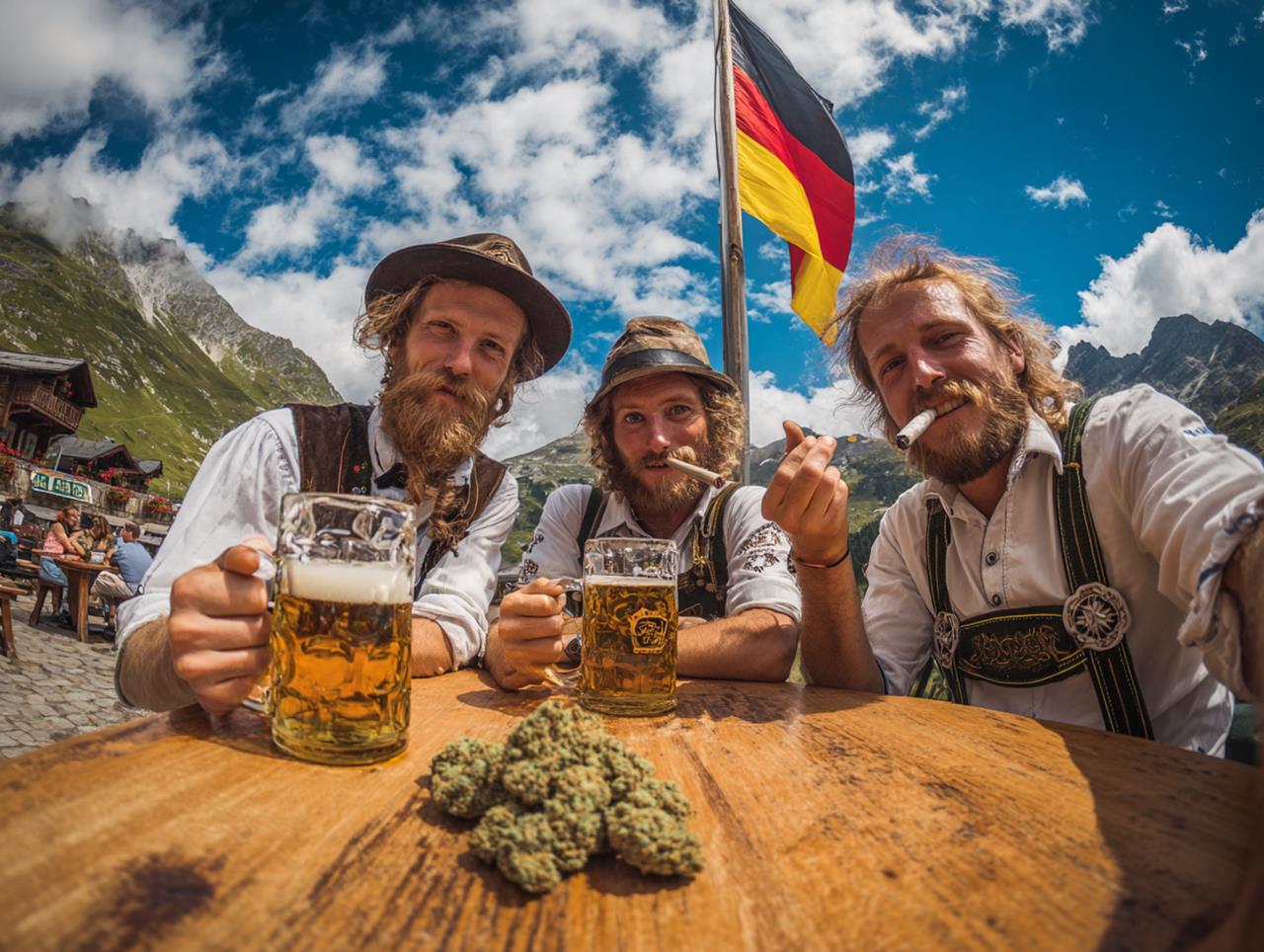 Drei Deutsche in Lederhosen trinken Bier aus Maßkrügen und rauchen Joints, vor ihnen ein runder Tisch mit Marihuana, im Hintergrund berge und almen, neben ihnen eine Deutschlandflagge, einer der Männer hält grinsend einen joint in die kamera, blauer himmel und weiße wolken, weiter panoramablick, fotorealistisch –ar 4:3 –v 7 Job ID: c5256052-f45d-4555-b3dc-5a4c97630b3d