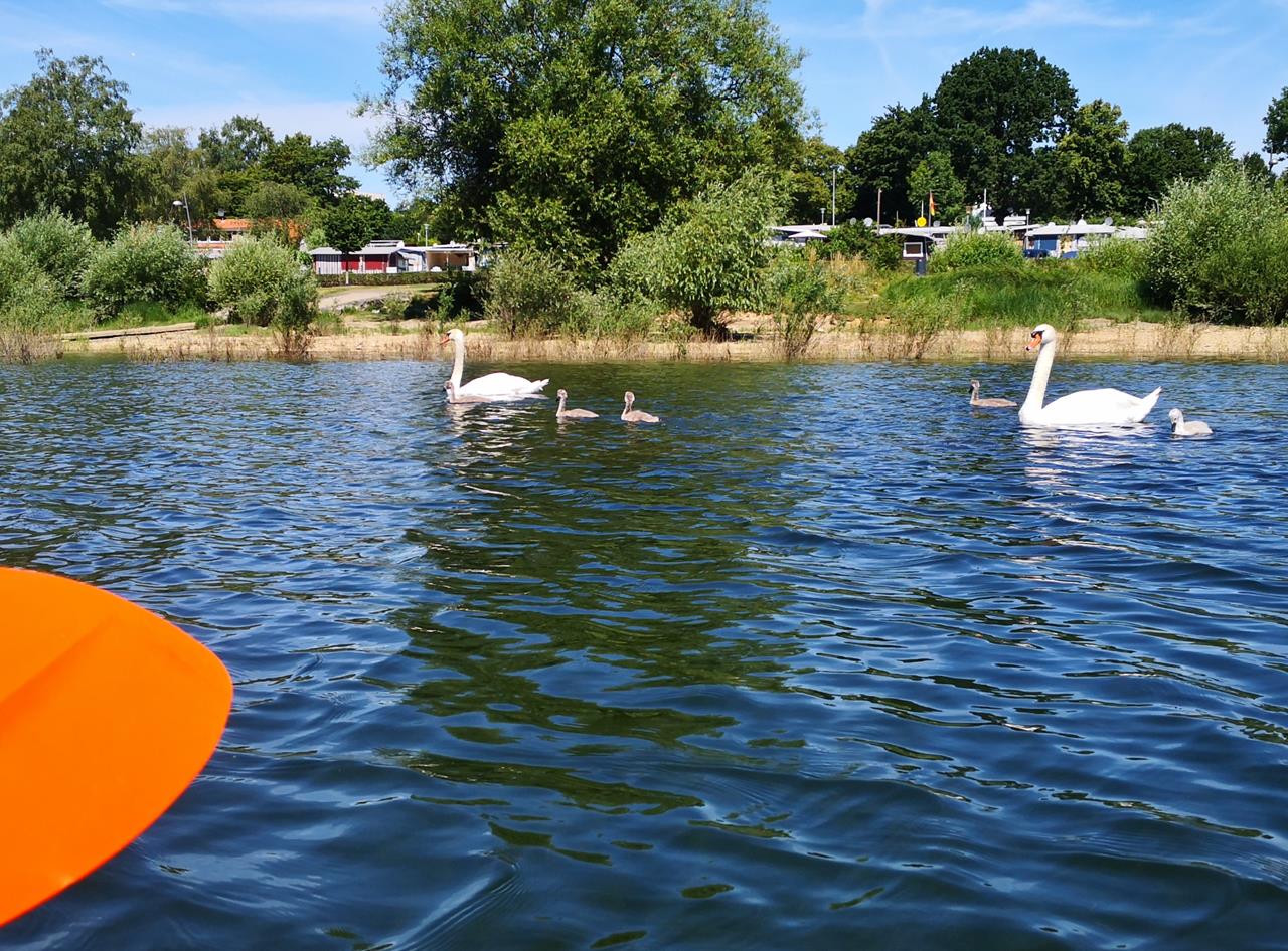 Schwanenfamilie vor Camping-Platz