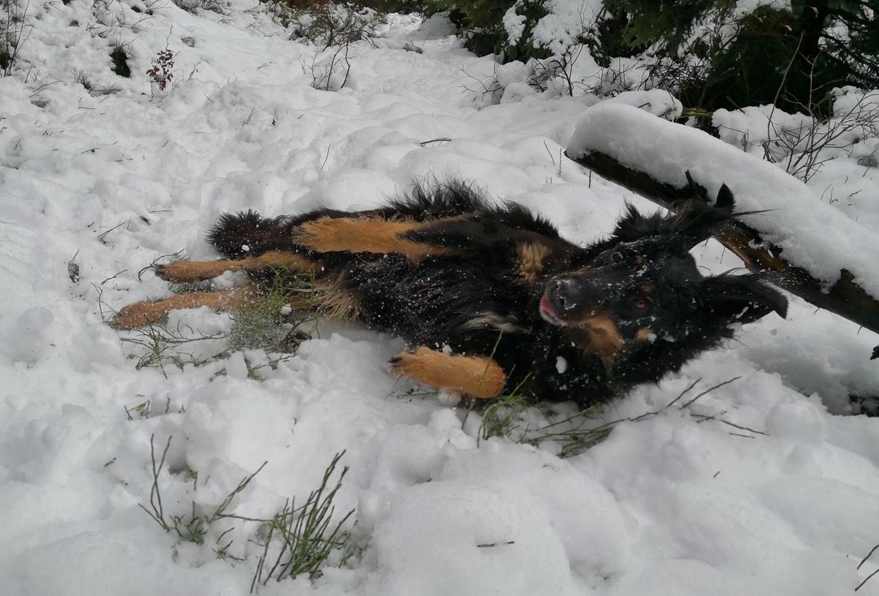 Doxi rollt sich erst einmal schön im Schnee ab.