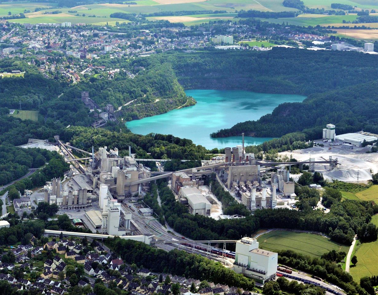 Luftbild vom Kalkwerk Flandersbach mit der gefluteten alten Grube und Wülfrath dahinter (Foto Walter Koch | http://commons.wikimedia.org | Lizenz: CC BY-SA 3.0 DE)