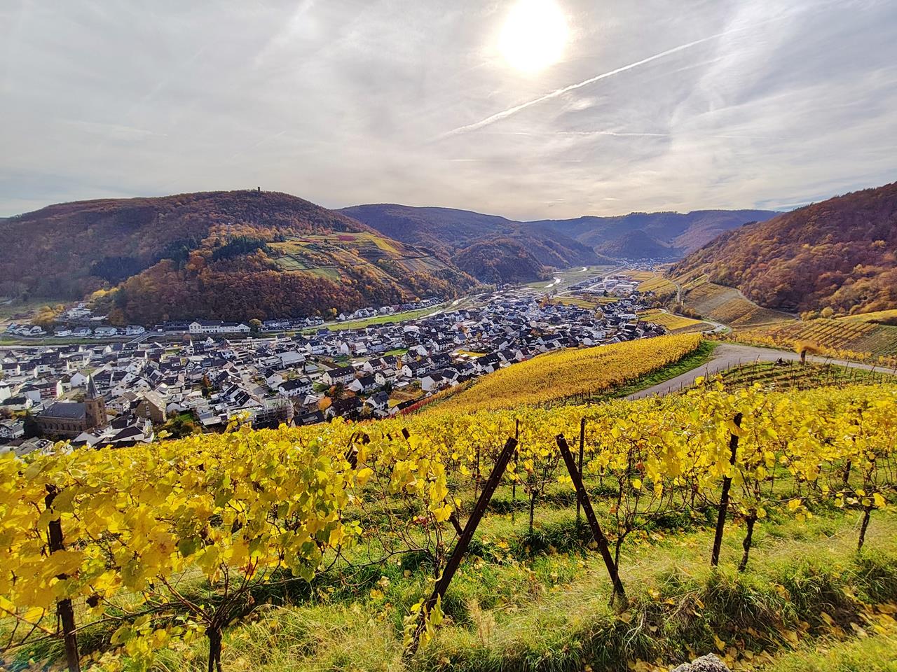 Blick ins Ahrtal über Dernau. Im Hintergrund der Krausberg