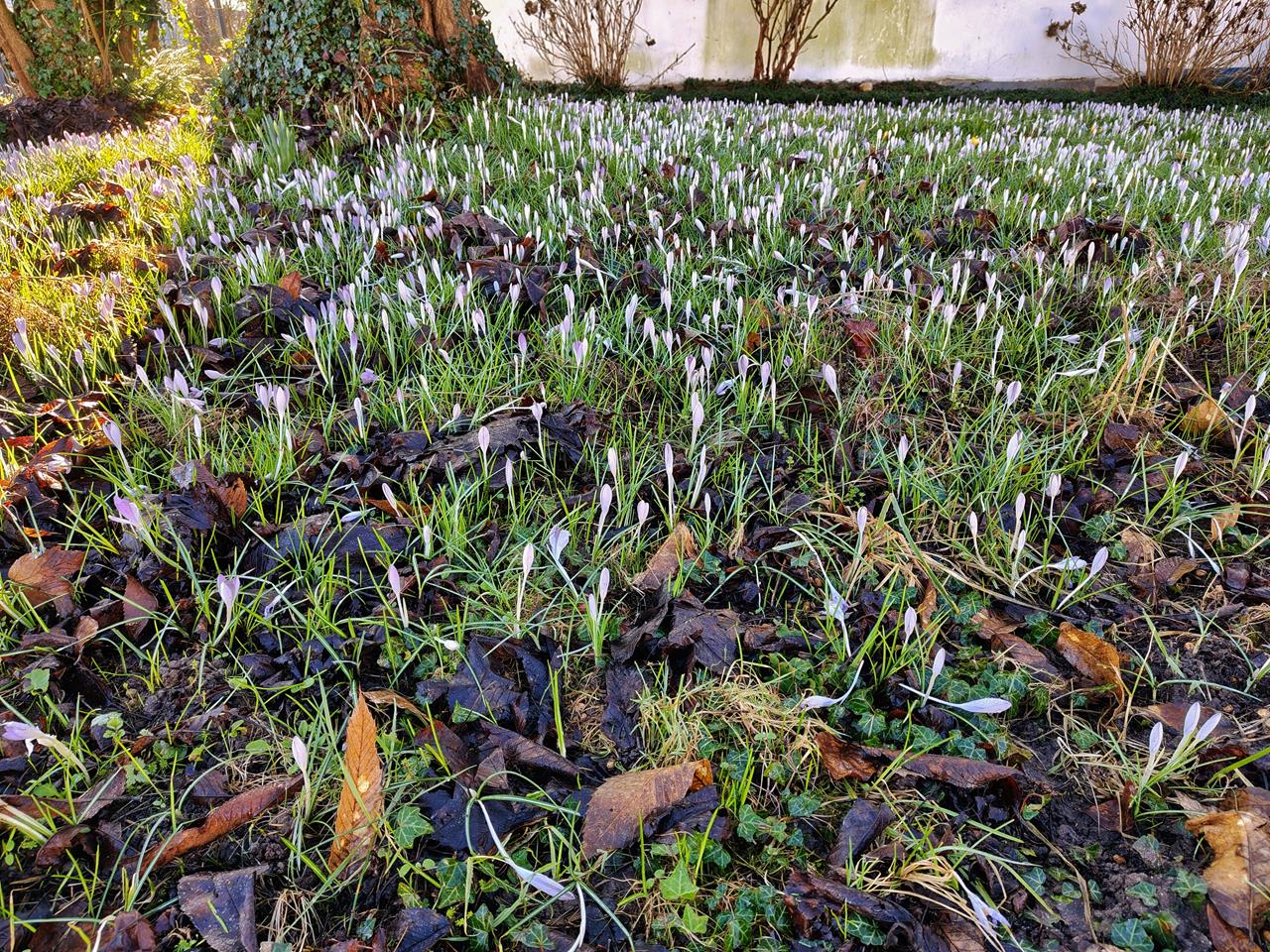 Vorgarten mit unzählichen Krokussen in Bedburdyck