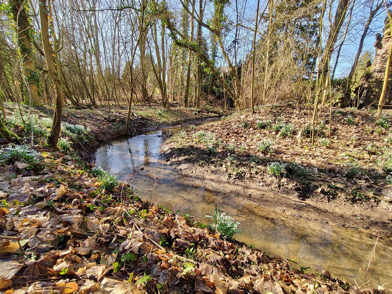 Der Jüchener Bach am Park des Nikolausklosters