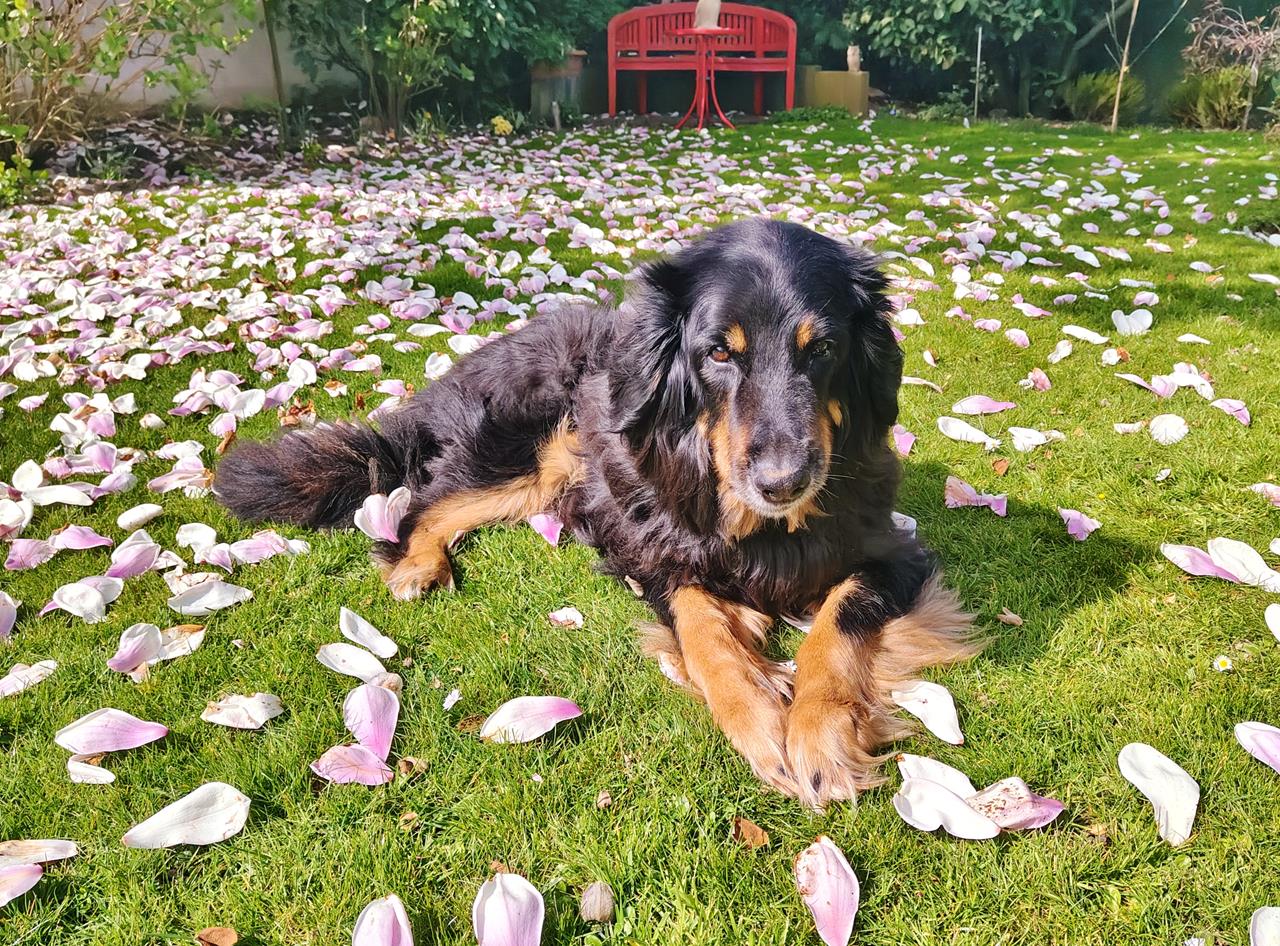 Doxi in den Magnolienblüten, in ihrem 13. Lebensjahr