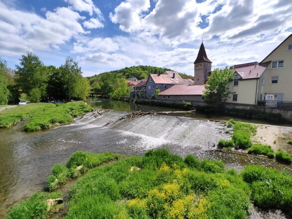 Meine letzte Station im Taubertal heute: Creglingen auf halber Strecke zwischen Bad Mergentheim und Rothenburg ob der Tauber. Hier kann sich Doxi zum ersten Mal so richtig in der Tauber stärken, denn hinter dem großen Wehr an der Tauberbrücke ist der Fluss besonders seicht.
