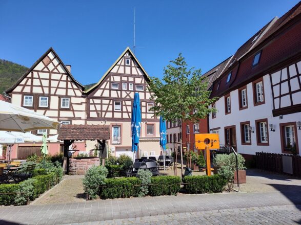 Das erste Mal, dass ich heute dem Fluss Queich begegne, ist im beschaulichen Ort Annweiler am Trifels. Der Ort liegt im Queichtalunterhalb des Bergmassivs mit dem Trifels und der gleichnamigen Burg.