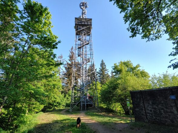 Bevor es wieder zu heiß wird, fahre ich mit Doxi am frühen Morgen zum Fuchsbuck, der zweithöchsten Erhebung des Kaiserstuhls westlich von Eichstätten. Wir wollen hinauf wandern zum 2006 erbauten Eichelspitzturm, der eine tolle Rundumsicht bieten soll.
