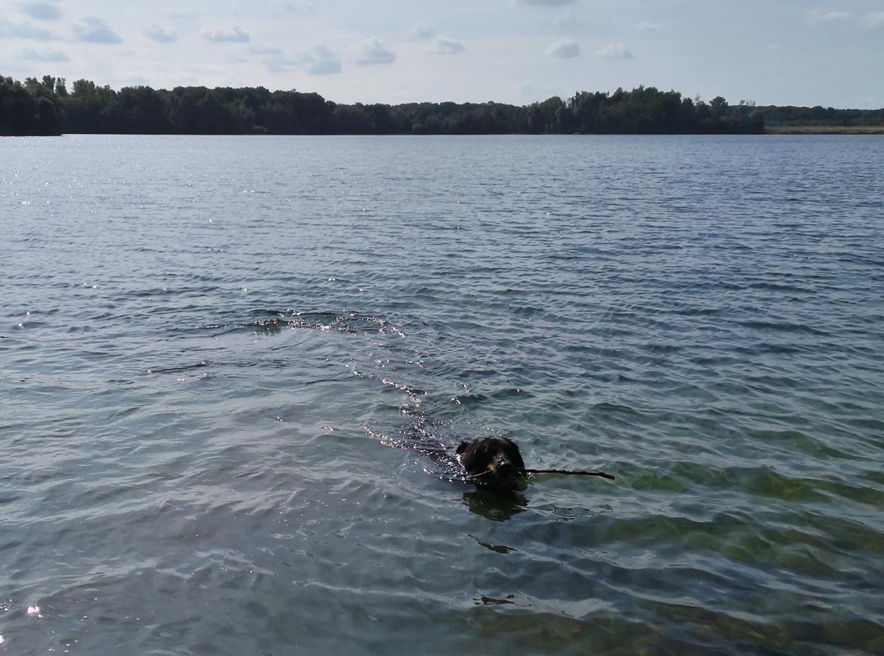 Doxi schwimmt im Angermunder See
