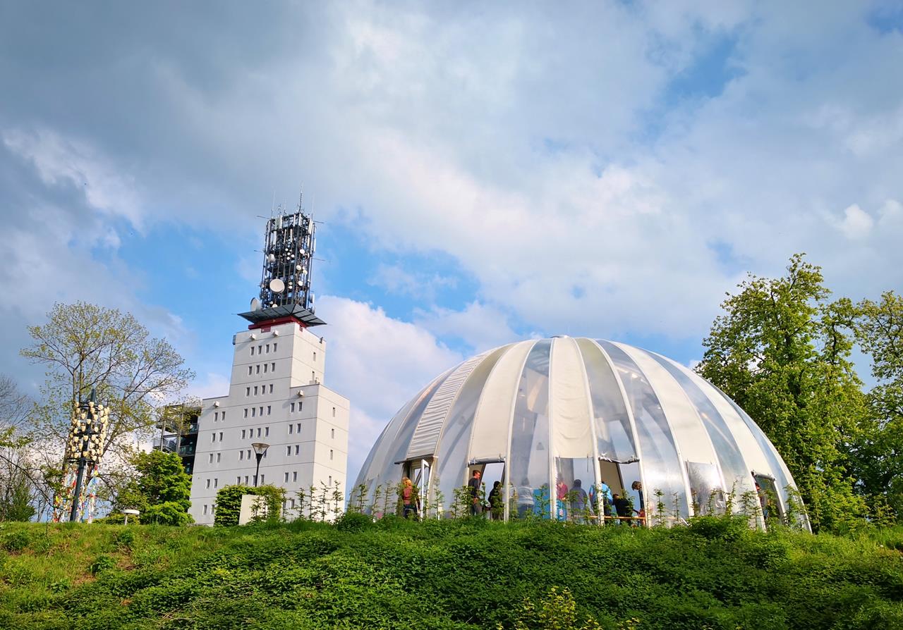 Weiter → Links der Schaumbergturm, rechts das Himmelszeit, in dem bei unserem Besuch gerade eine katholische Messe statt fand