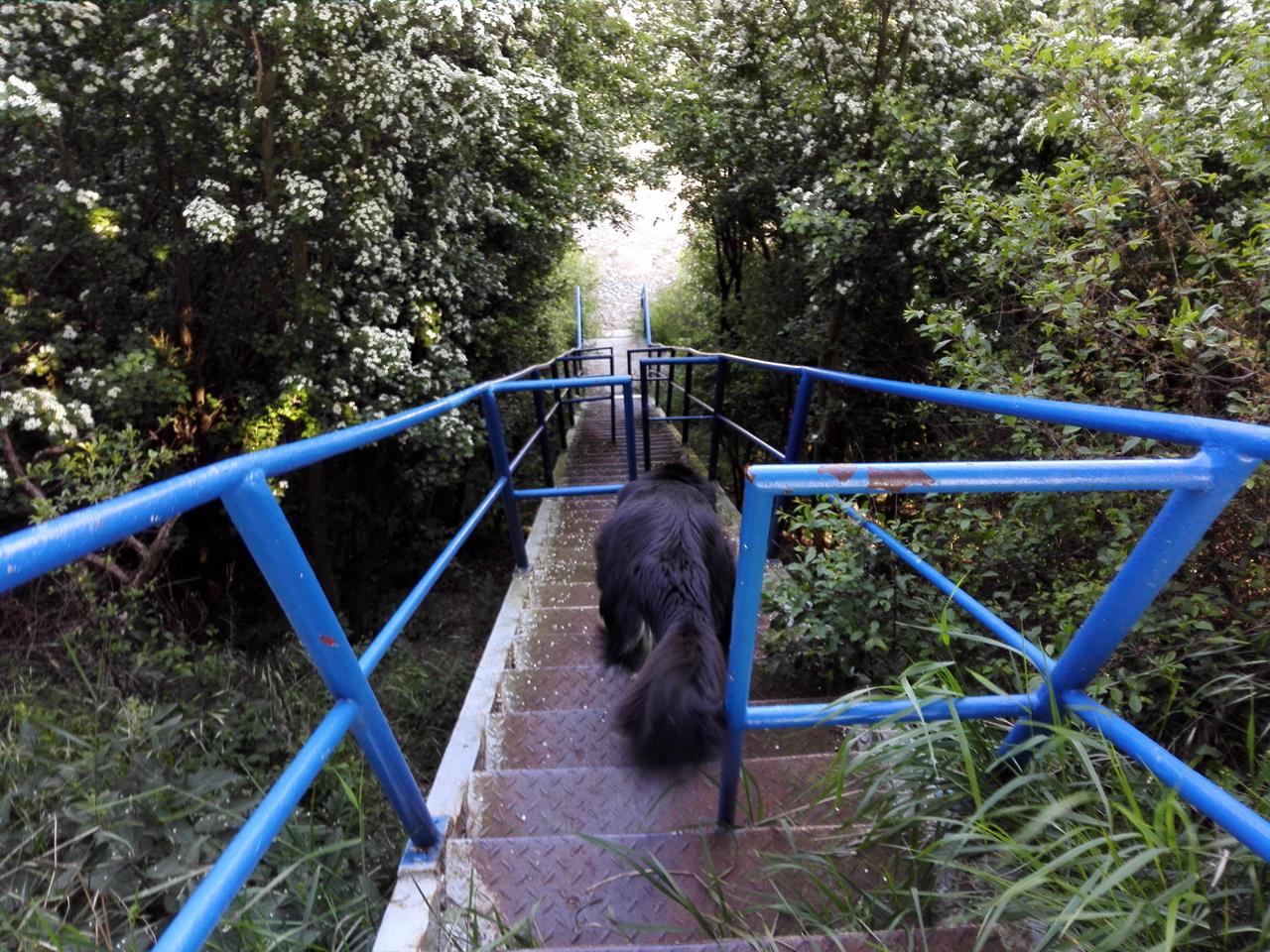 Doxi nimmt die steile Treppe hinunter zum Strand