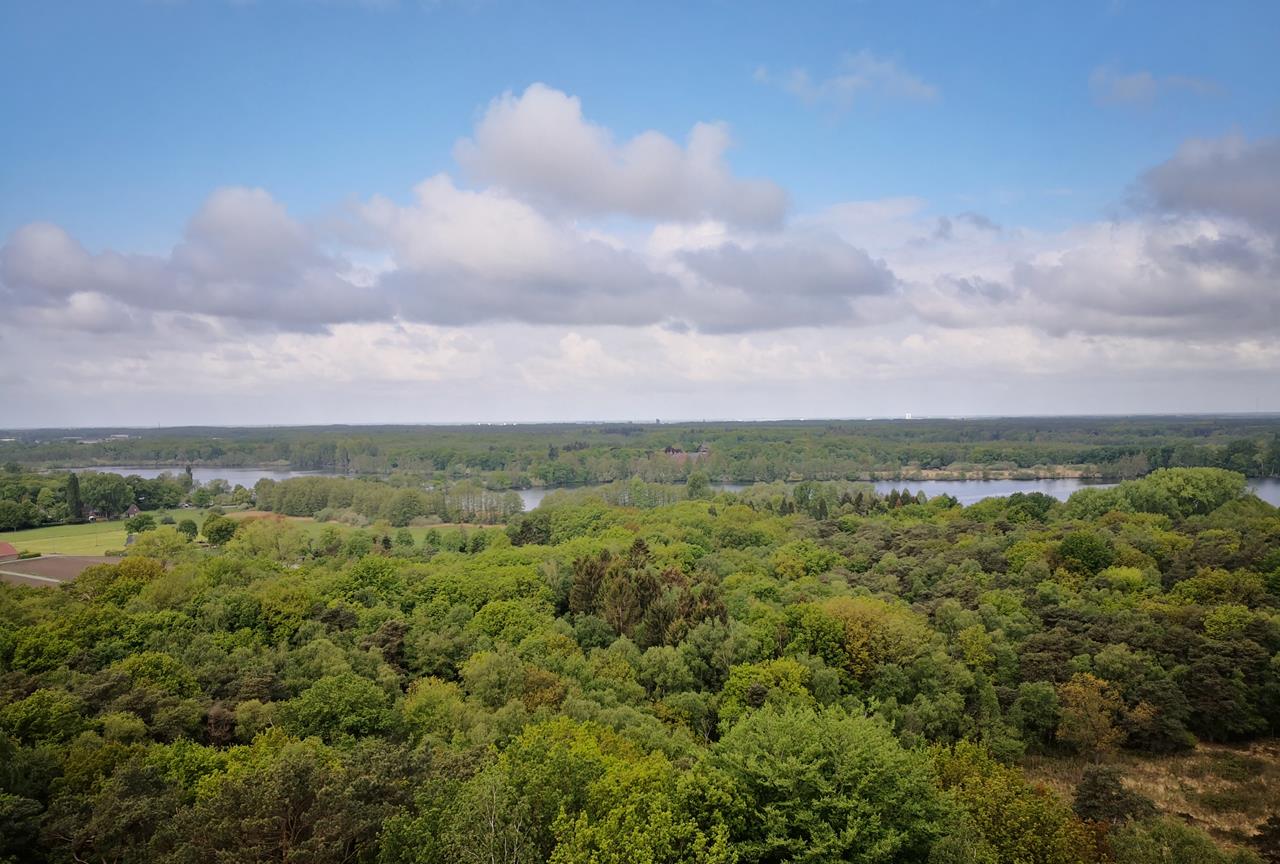Weiter → Blick vom Aussichtsturm auf den Hinsbecker Höhen zu den Krickenbecker Seen. Die Bauten am Horizont gehören bereits zu Venlo.