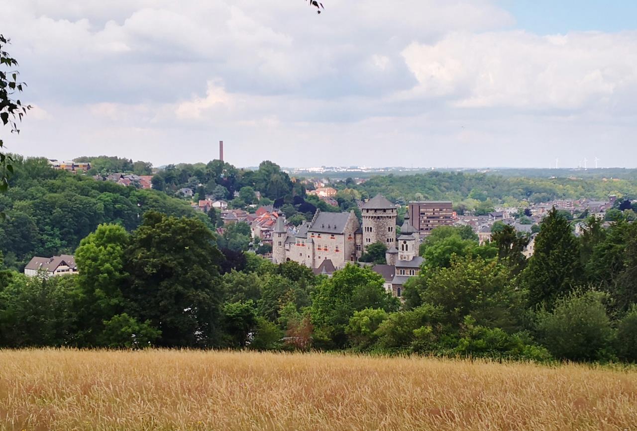 Blick aus dem Waldgebiet am Hammerbug hinunter zur Altstadt von Stolberg mit der Burg