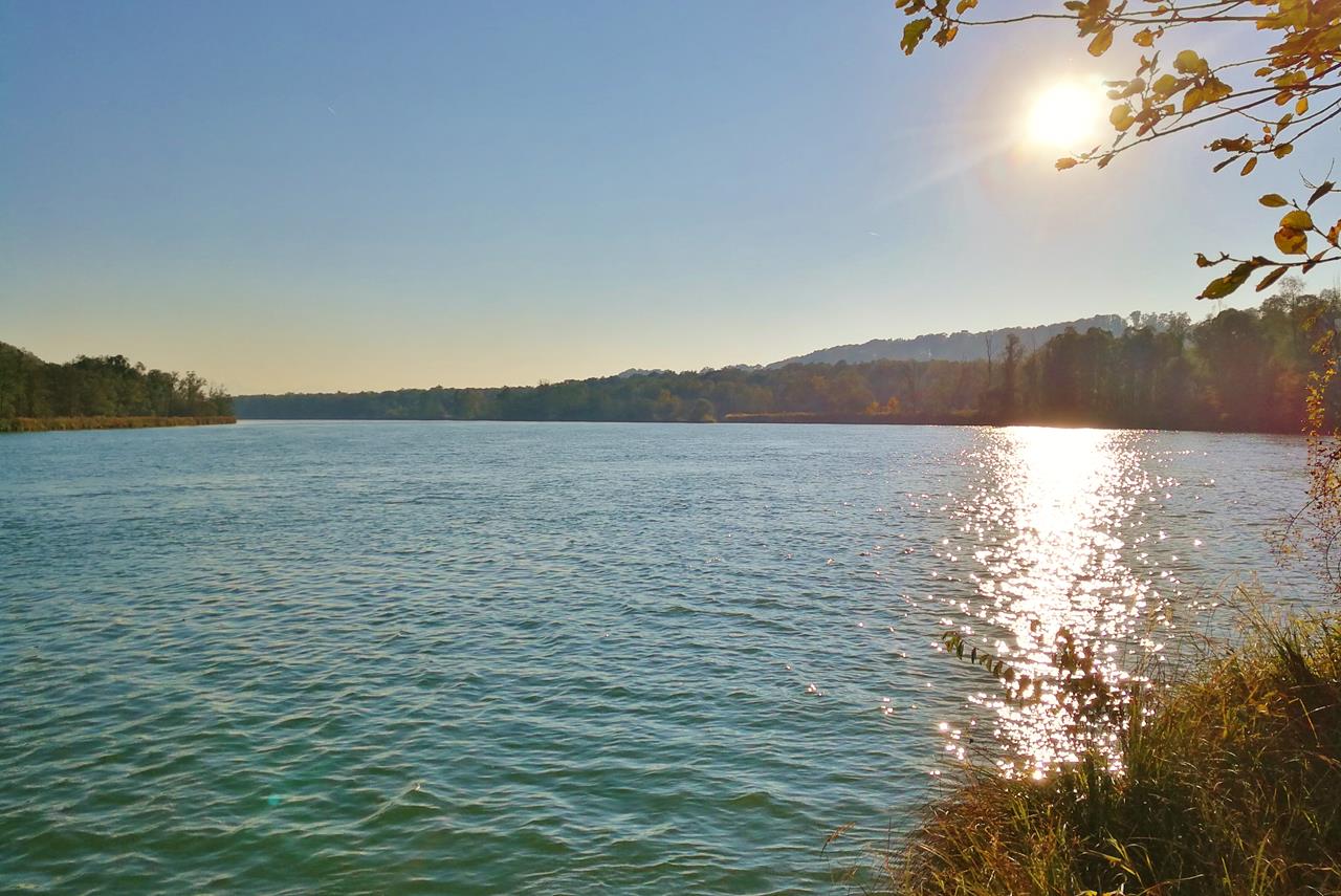 Vor dem Wasserkraftwerk Wasserburg staut sich der Inn zu einem breiten See auf