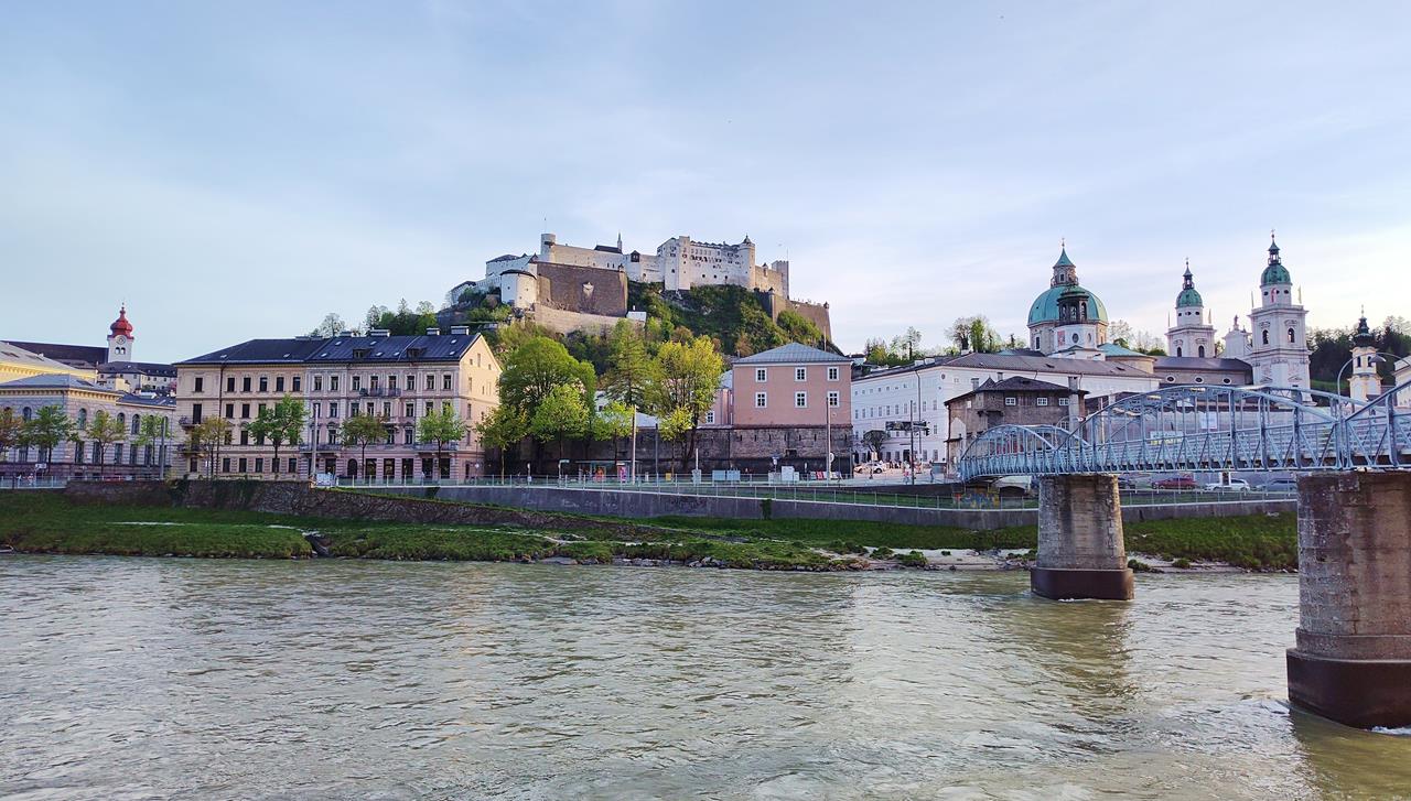 Panoramablick vom Mozartsteg (rechts) zur Altstadt