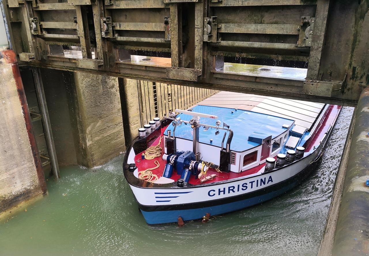 schleuse_huenxe_okt_2019_022_1280x888 ← Zurück Weiter → Nach dem Hochziehen des bergseitigen Schleusentores verlässt die Christine die Schleuse talwärts
