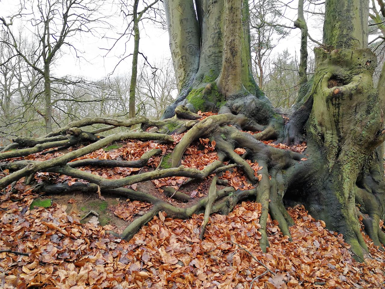 Verschlungene Wurzeln dreier miteinander verwachsener Buchen