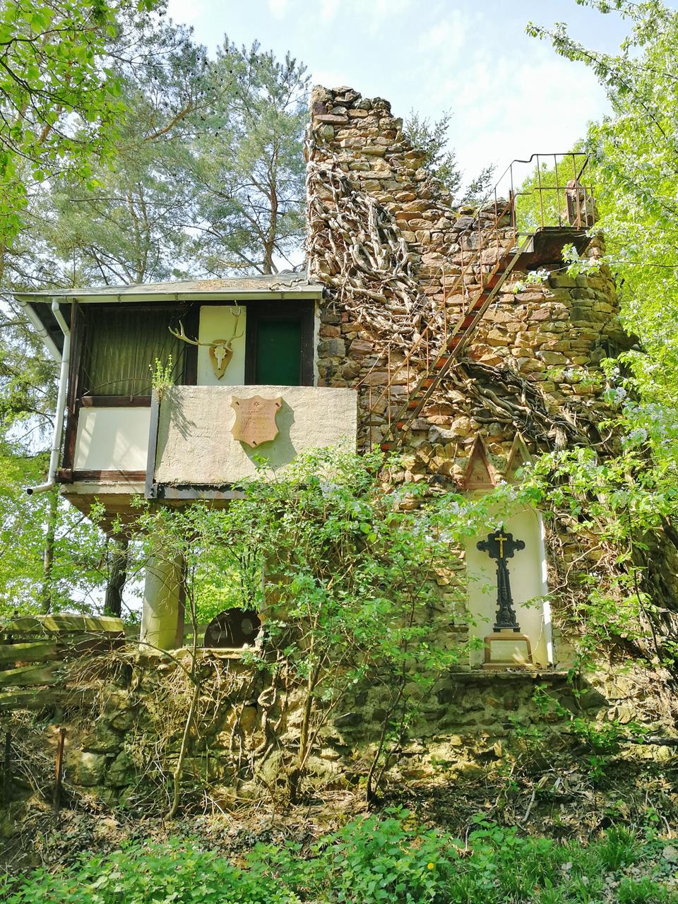 Skurriler, halb verfallener Turm mit angebauter Jagdhütte am Waldrand