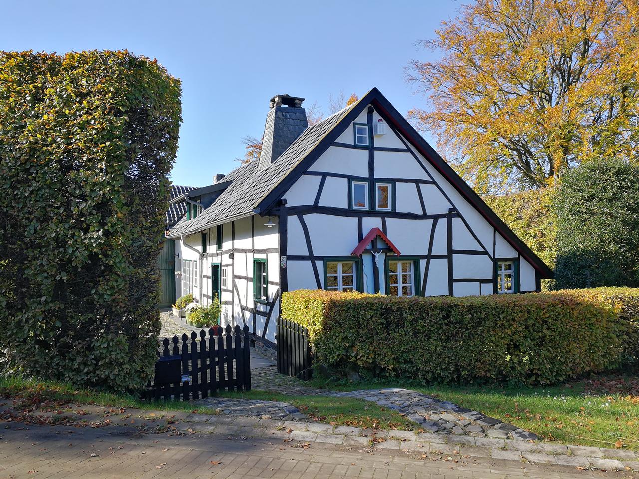 ← Zurück Weiter → Denkmalgeschütztes Haus in Eicherscheid. Typisch für die Region sind die haushohen Buchenhecken und das Kreuz an der Hausfassade