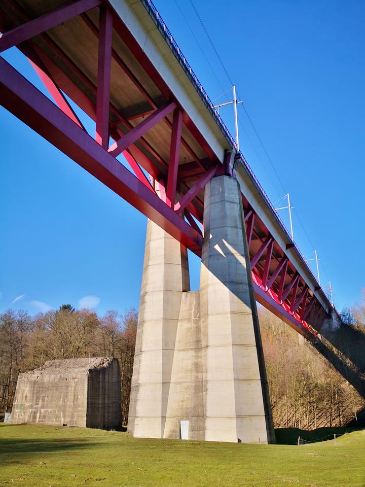 Oben donnert ein TGV über die Eisenbahnbrücke